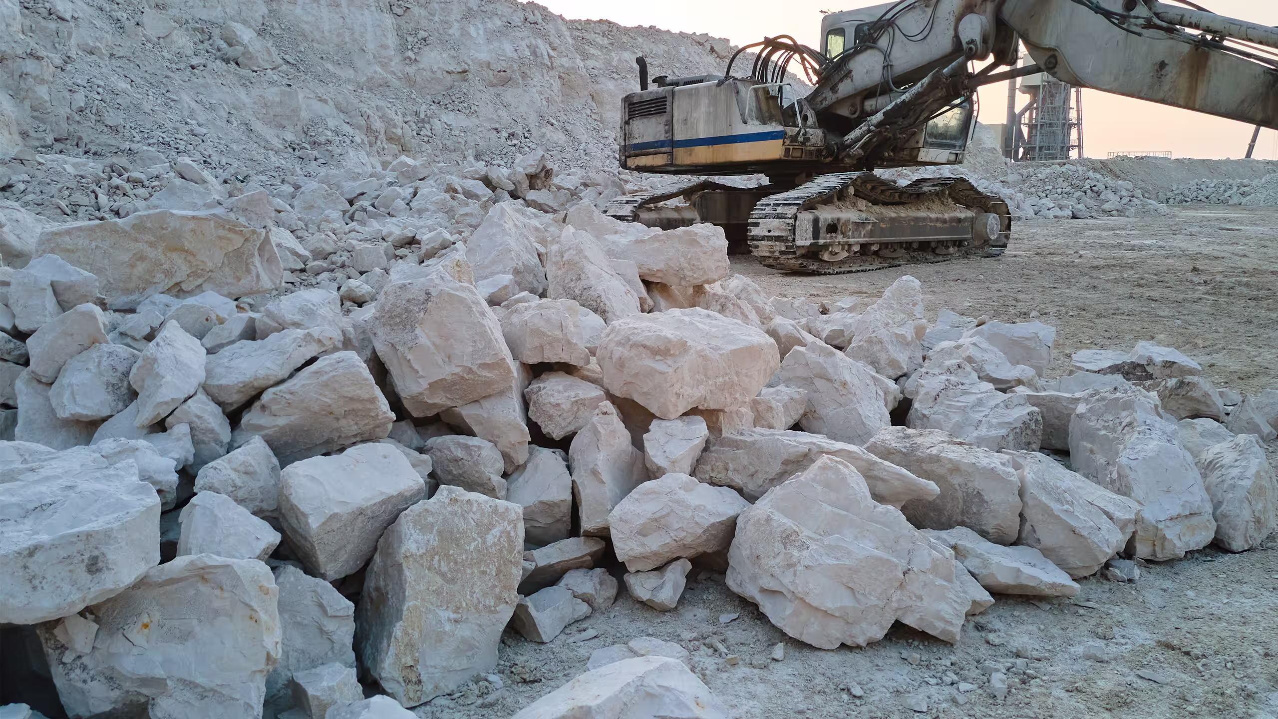 Après l’abattage, les blocs sont triés un par un à l’aide de pelles hydrauliques puissantes et de pinces de tri, pour garantir le respect des classes granulaires demandées.